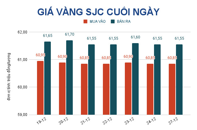 Trước đó, do từ 9 giờ đến 17 giờ ngày 27-12 giá vàng thế giới biến động không đáng kể, sức mua gần bằng không nên trong khoảng thời gian này, giá vàng SJC tại Việt Nam bất động tại 61,55 triệu đồng/lượng, cao hơn giá vàng thế giới quy đổi khoảng 11 triệu đồng/lượng.