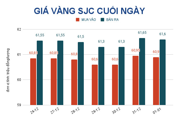 Ngày 2-1, thị trường vàng trong nước tiếp tục kỳ nghỉ Tết Dương lịch. Giá vàng SJC được một số doanh nghiệp niêm yết mua vào 60,9 triệu đồng/lượng, bán ra 61,6 triệu đồng/lượng, ổn định so với hôm qua.