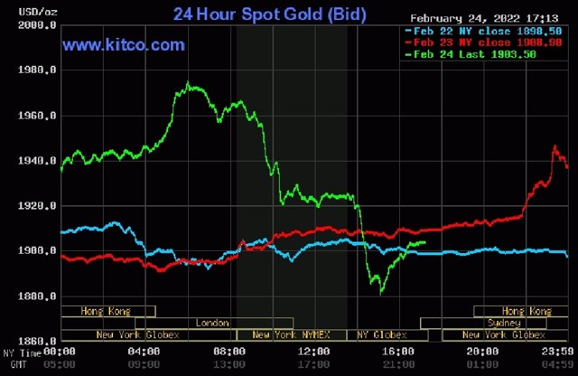 Tại thị trường thế giới, giá vàng đảo chiều vào cuối phiên giao dịch ngày thứ Năm (24/2), giảm xuống dưới ngưỡng 1.900 USD/ounce vì thị trường chứng khoán phục hồi, sau khi Tổng thông Mỹ Joe Biden công bố các lệnh trừng phạt mới đối với Nga.
