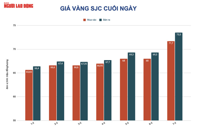 Như vậy, nếu tính mức giá vào cuối ngày 6-3 là 69,7 triệu đồng/lượng thì đến cuối ngày ngày 7-3, giá vàng SJC đã tăng tổng cộng 3,8 triệu đồng/lượng để thiết lập kỷ lục mới 73,5 triệu đồng/lượng.