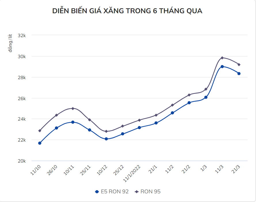 Ngày 21/3, giá xăng trong nước đã được điều chỉnh giảm lần đầu tiên sau 7 kỳ tăng liên tiếp. Theo đó, mặt bằng giá bán lẻ trong nước với xăng RON 95 giảm 632 đồng/lít còn 29.192 đồng/lít; xăng E5 RON 92 giảm 655 đồng/lít còn 28.330 đồng/lít.