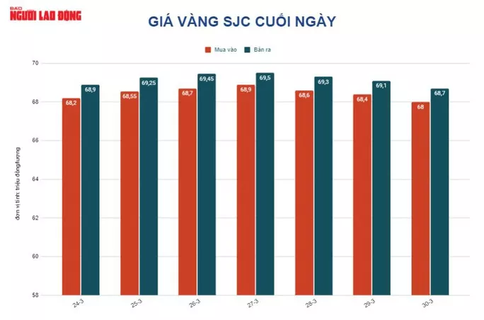 Trước đó, từ 9 giờ đến 17 giờ ngày trong ngày 30-3, do sức mua yếu và giá vàng thế giới gần như bất động nên trong khoảng thời gian này, giá vàng SJC liên tục giảm tổng cộng 550.000 đồng/lượng, chốt cuối ngày tại 68,7 triệu đồng/lượng.