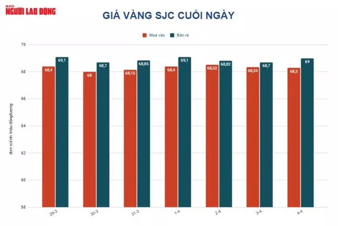 Trước đó, từ 9 giờ đến 17 giờ ngày 4-4, tuy giá vàng thế giới gần như bất động, giá vàng SJC vẫn tăng 50.000 đồng/lượng, chốt cuối ngày 69 triệu đồng/lượng.