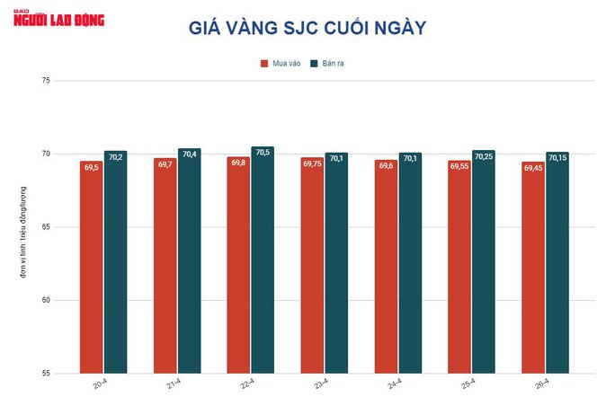 Trước đó, trong ngày 26-4, giá vàng SJC biến động không đáng kể, chốt cuối ngày tại 70,15 triệu đồng/lượng, tăng 50.000 đồng/lượng.