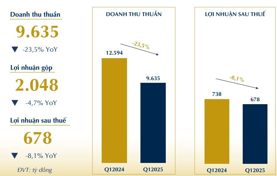 Cụ thể, doanh thu thuần trong ba tháng đầu năm đạt 9.635 tỷ đồng, giảm 23,5% so với quý I/2024. Lợi nhuận sau thuế đạt 678 tỷ đồng, tương đương mức giảm hơn 8% so với cùng kỳ năm trước.