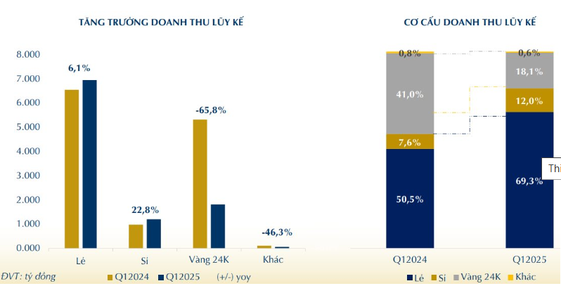 Ngược lại, mảng kinh doanh vàng 24K chứng kiến mức sụt giảm mạnh gần 66% so với cùng kỳ năm ngoái. Nguyên nhân chủ yếu xuất phát từ tình trạng thiếu hụt nguyên liệu đầu vào và sự hạn chế kéo dài trong nguồn cung sản phẩm vàng 24K từ nửa cuối năm 2024. Trước thực trạng đó, công ty đã chủ động điều tiết lại cơ cấu kinh doanh, ưu tiên nguồn lực cho lĩnh vực trang sức bán lẻ nhằm duy trì hiệu quả hoạt động.